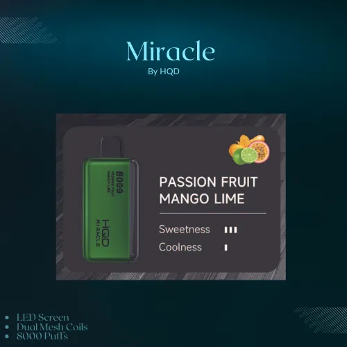 Discover the exotic taste of the HQD Miracle 8000 Passionfruit Mango Lime disposable vape. This flavour delivers a tropical medley of fruitiness with a zesty twist, creating a refreshing and flavorful vape experience with every puff.