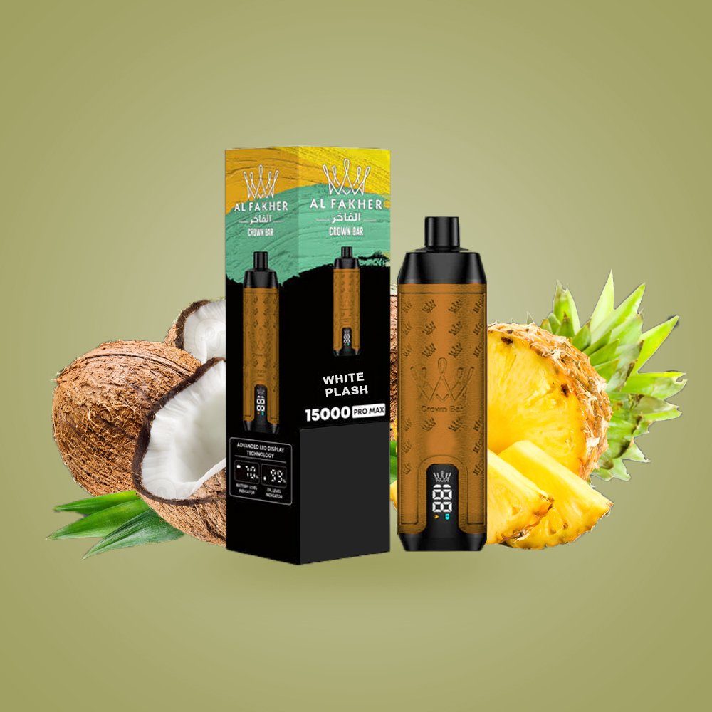 Escape to the tropics with the luscious blend of coconut and pineapple in the Crown Bar Pro Max 15000 White Plash vape. Explore the full range of Al Fakher Crown Bar Pro Max flavours and elevate your vaping experience today!